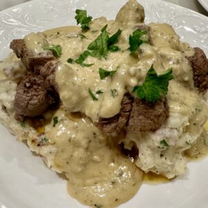 - Drain your potatoes in a strainer and then add them back into a pot. Mash your potatoes with a hand masher and add butter, heavy cream and season to your liking. Your dish is ready to serve! Start by plating the prime time garlic & butter steak bites over the potatoes and then pouring the creamy parmesan sauce on top with a gravy boat. Now you’re ready to dig in and enjoy!