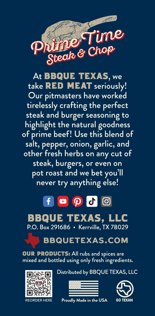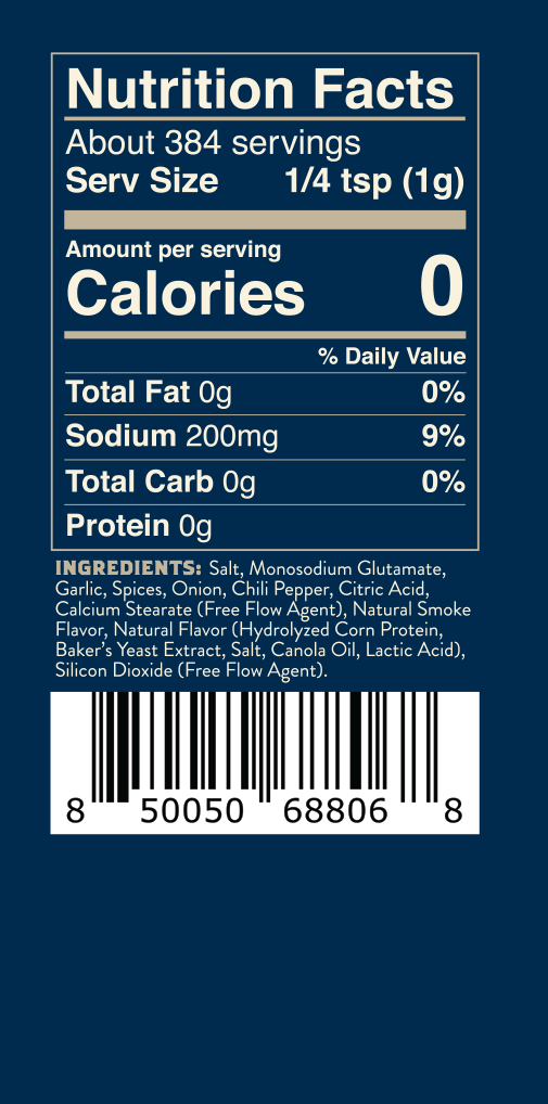 Salt, Monosodium Glutamate, Garlic, Spices, Onion, Chili Pepper, Citric Acid, Calcium Stearate (Free Flow Agent), Natural Smoke Flavor, Natural Flavor (Hydrolyzed Corn Protein, Baker’s Yeast Extract, Salt, Canola Oil, Lactic Acid, Silicon Dioxide (Free Flow Agent).