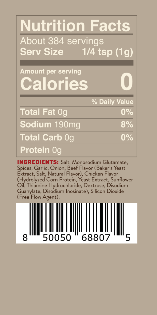 Salt, Monosodium Glutamate, Spices, Garlic, Onion, Beef Flavor (Baker’s Yeast Extract, Salt, Natural Flavor), Chicken Flavor (Hydrolyzed Corn Protein, Yeast Extract, Sunflower Oil, Thiamine Hydrochloride, Dextrose, Disodium, Guanyalte, Disodium Inosinate) Silicon Dioxide (Free Flow Agent).